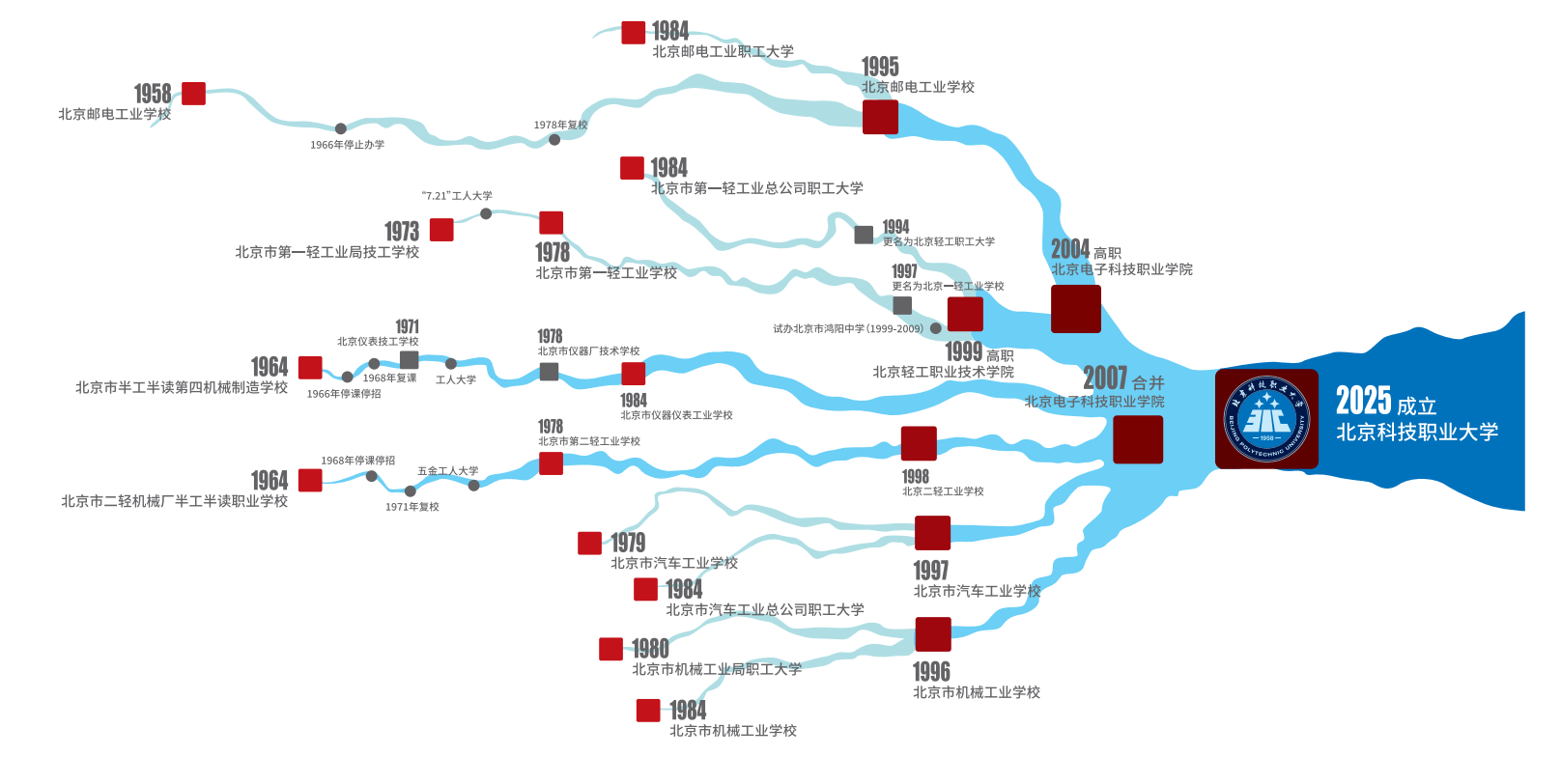 上世纪五、六十年代,新中国刚刚开启社会主义建设,为缓解行业技术技能人才之所需,北京邮电工业学校、北京仪器仪表学校、北京二轻工业学校等具有明显行业特色的中等专业学校应运而生。进入上世纪七十年代末、八十年代初,为适应国家经济社会建设的新需求,北京一轻工业学校、北京汽车工业学校、北京机械工业学校等相继诞生。